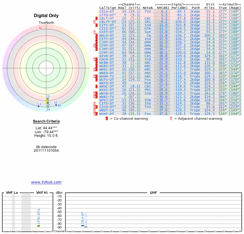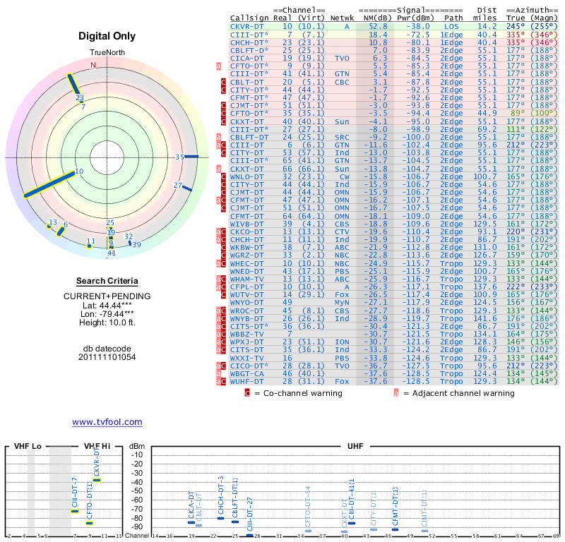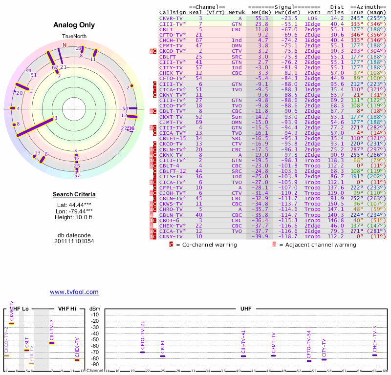 Here are the results for your location. The transmitter database was last updated on June 7, 2013. For more information about these plots and how to interpret them, please check out the Signal Analysis FAQ.