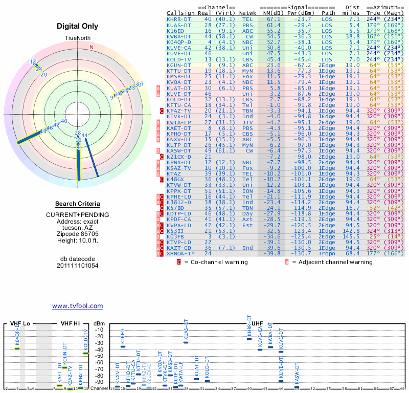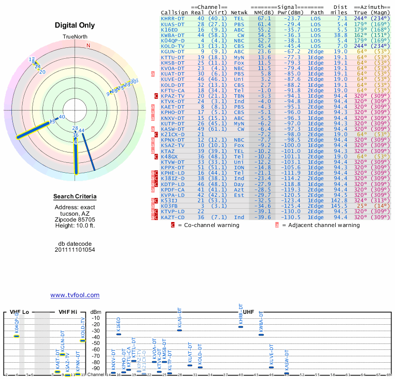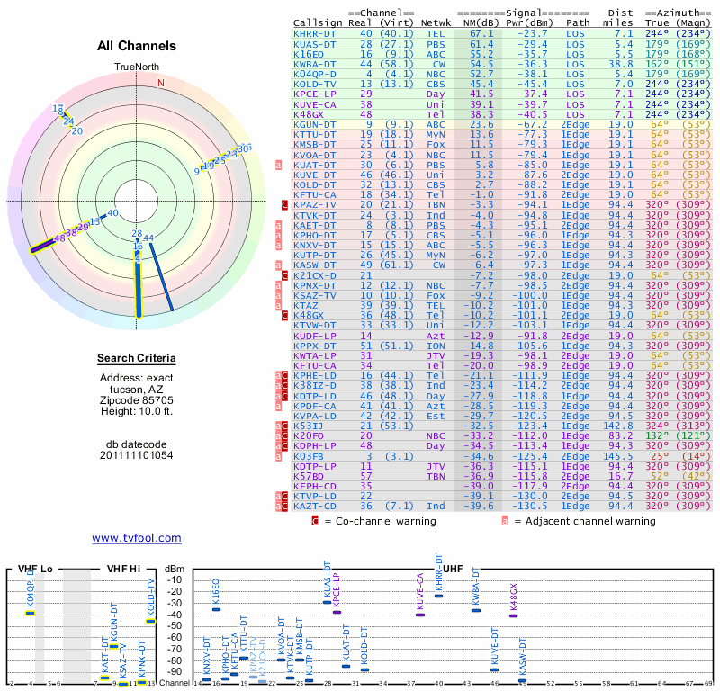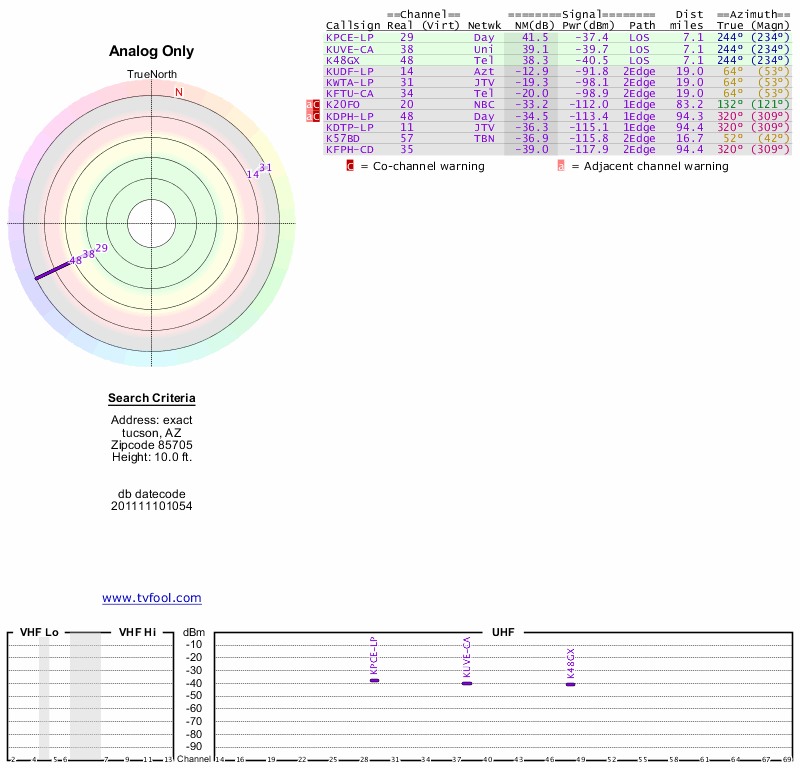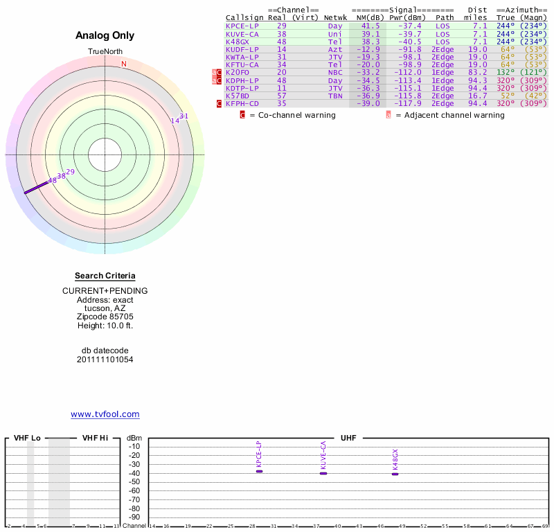Here are the results for your location. The transmitter database was last updated on June 7, 2013. For more information about these plots and how to interpret them, please check out the Signal Analysis FAQ.