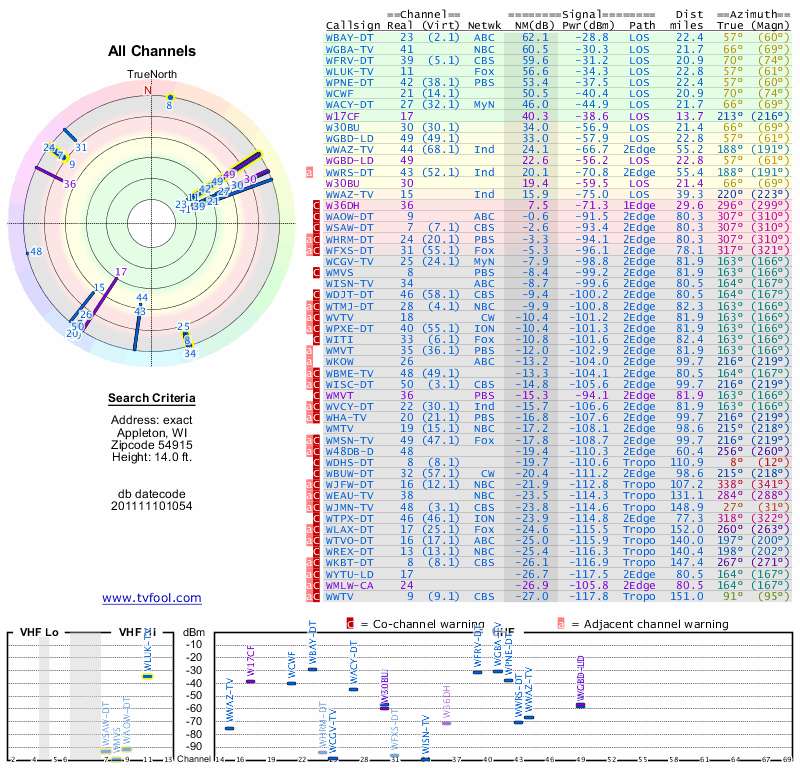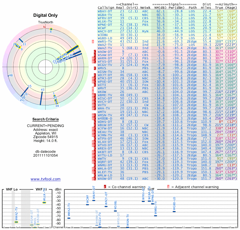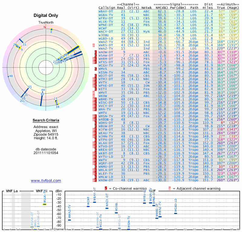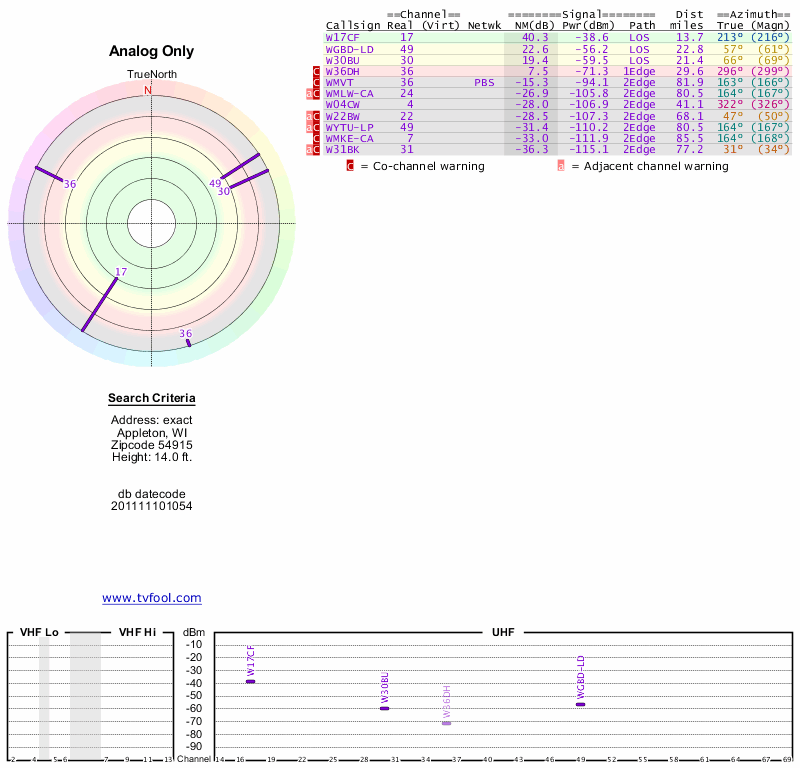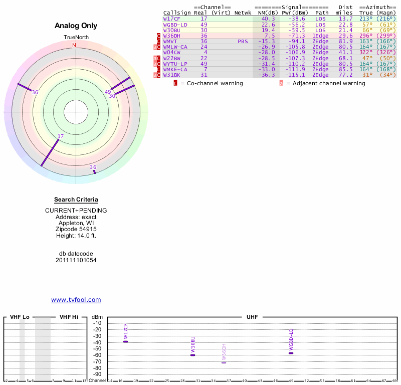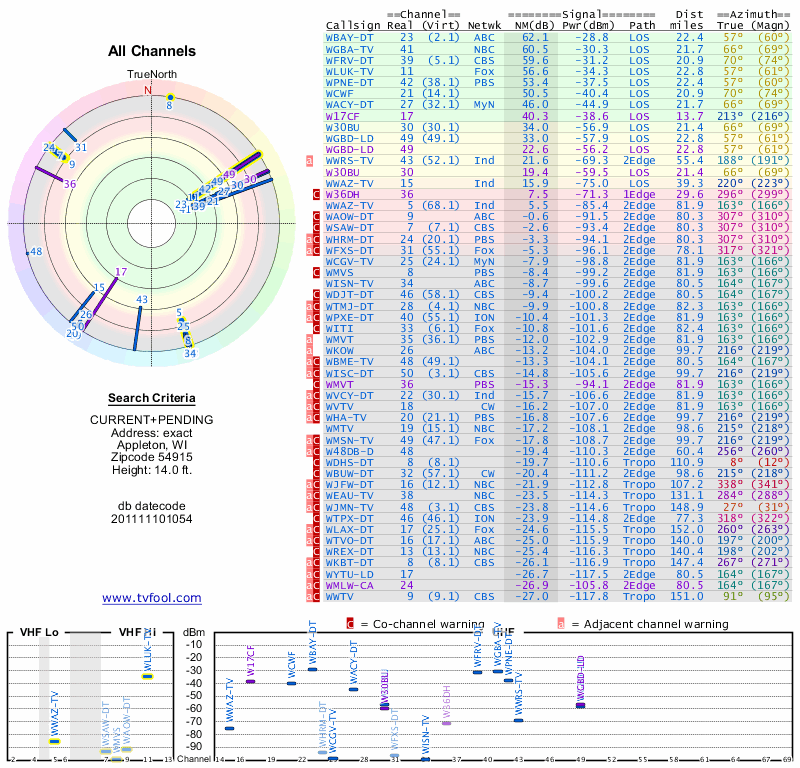 Here are the results for your location. The transmitter database was last updated on June 7, 2013. For more information about these plots and how to interpret them, please check out the Signal Analysis FAQ.