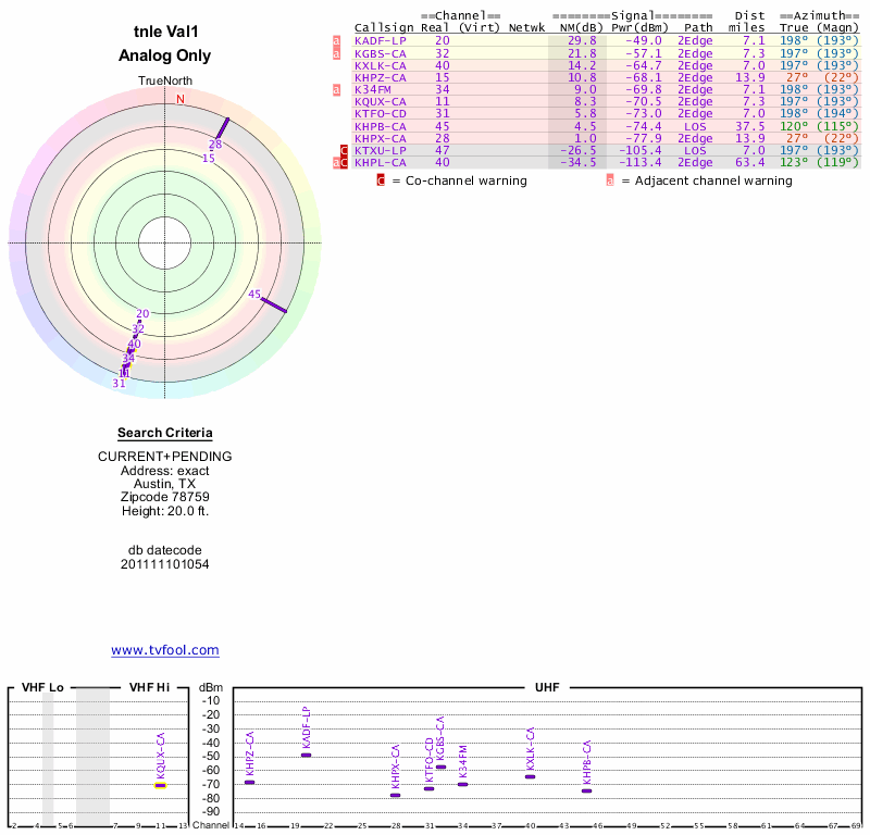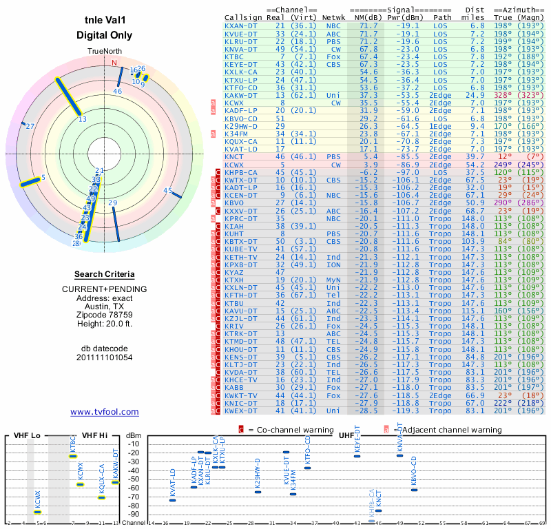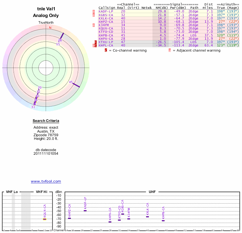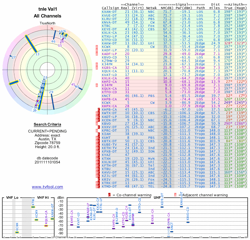 Here are the results for your location. The transmitter database was last updated on June 7, 2013. For more information about these plots and how to interpret them, please check out the Signal Analysis FAQ.