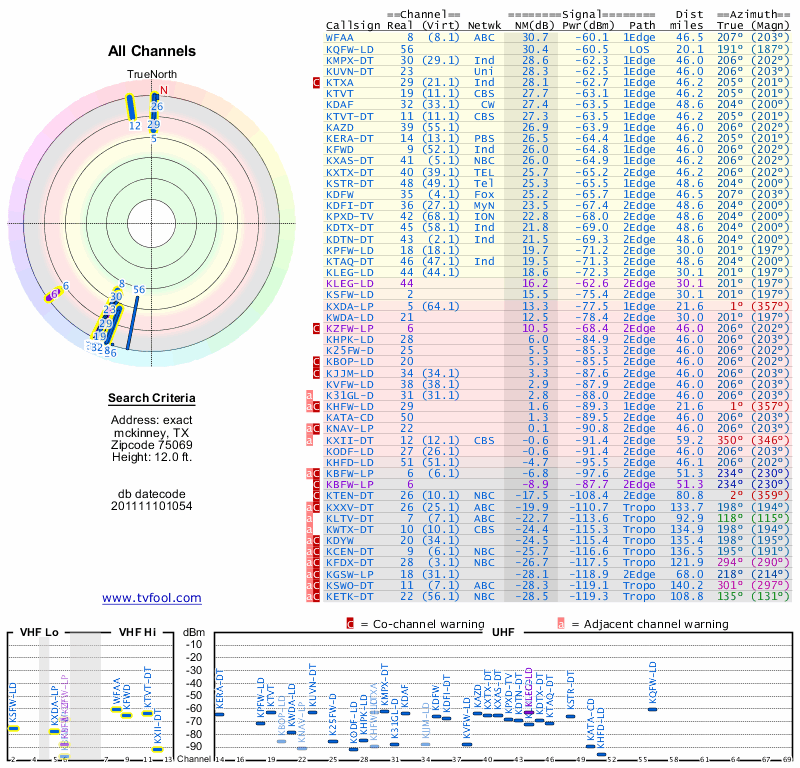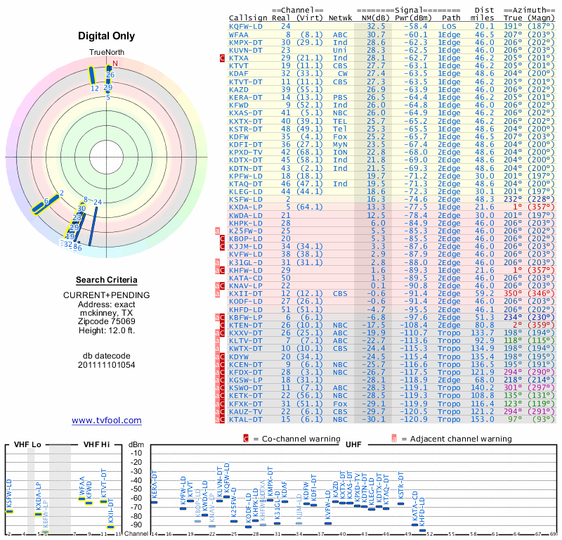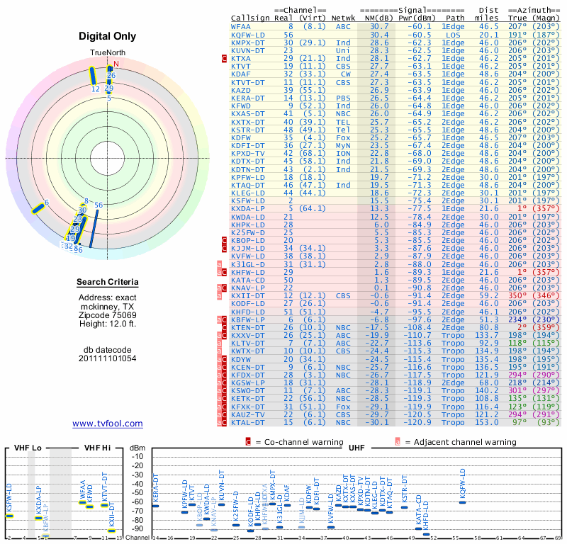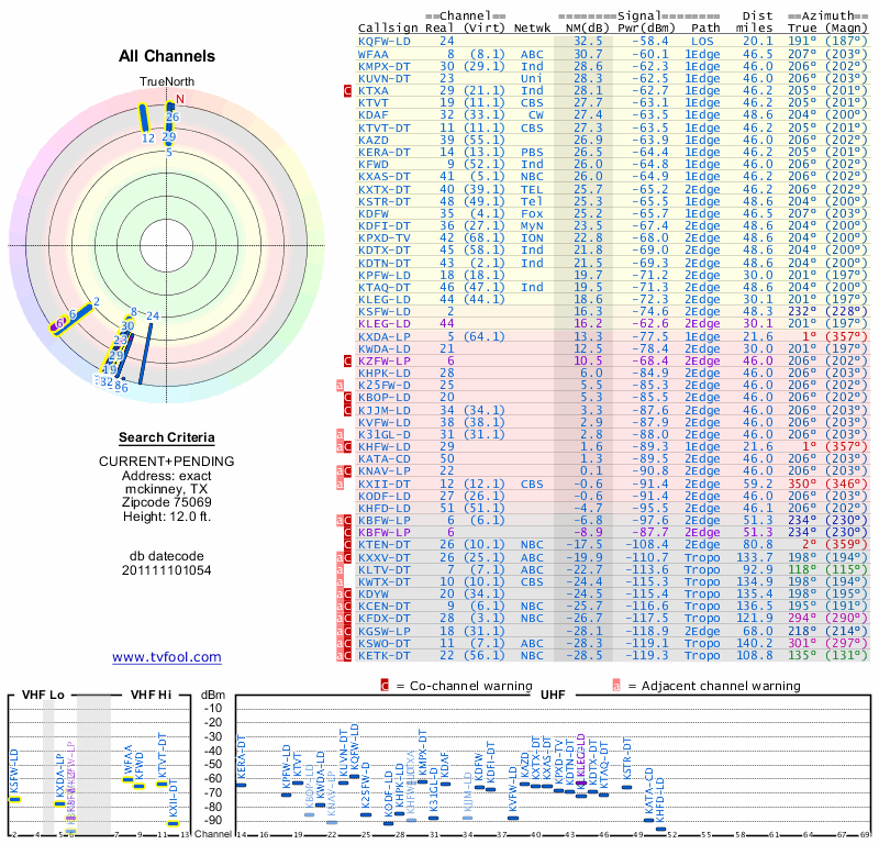 Here are the results for your location. The transmitter database was last updated on June 7, 2013. For more information about these plots and how to interpret them, please check out the Signal Analysis FAQ.