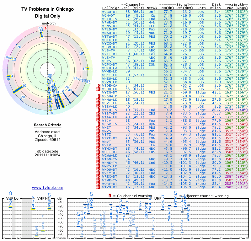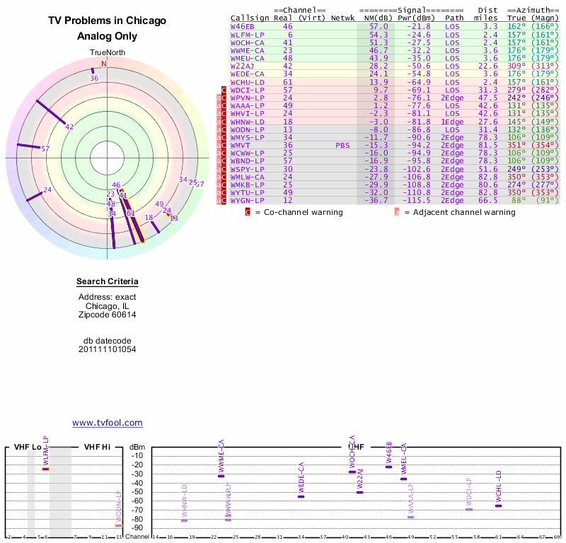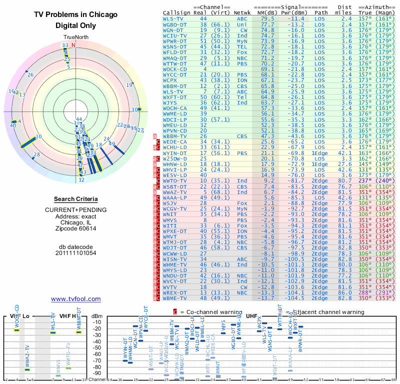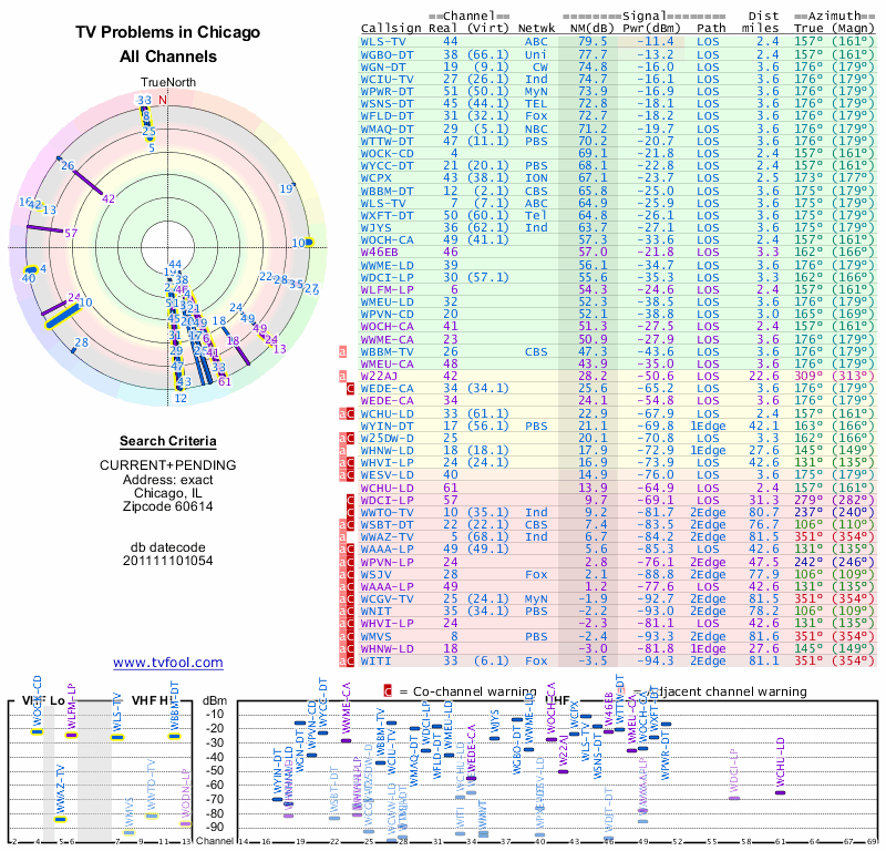 Here are the results for your location. The transmitter database was last updated on June 7, 2013. For more information about these plots and how to interpret them, please check out the Signal Analysis FAQ.