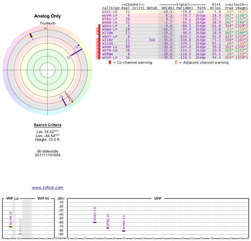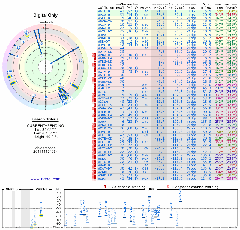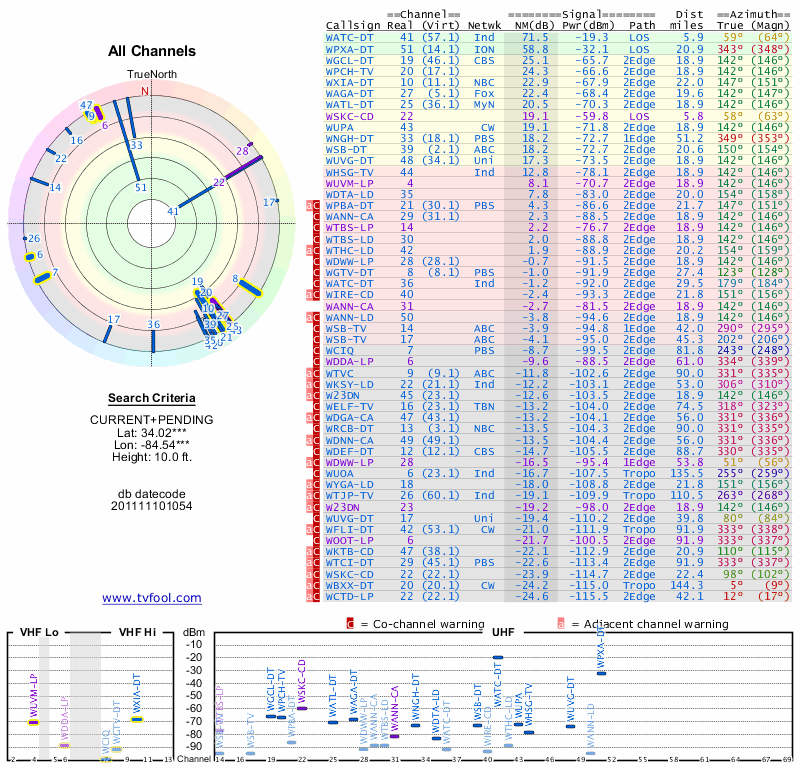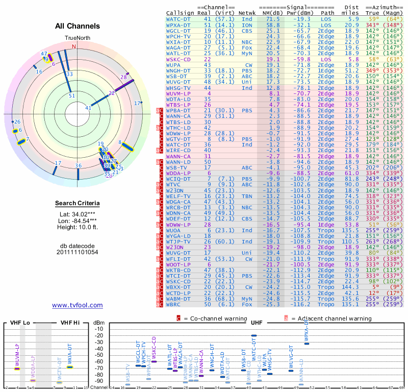 Here are the results for your location. The transmitter database was last updated on June 7, 2013. For more information about these plots and how to interpret them, please check out the Signal Analysis FAQ.