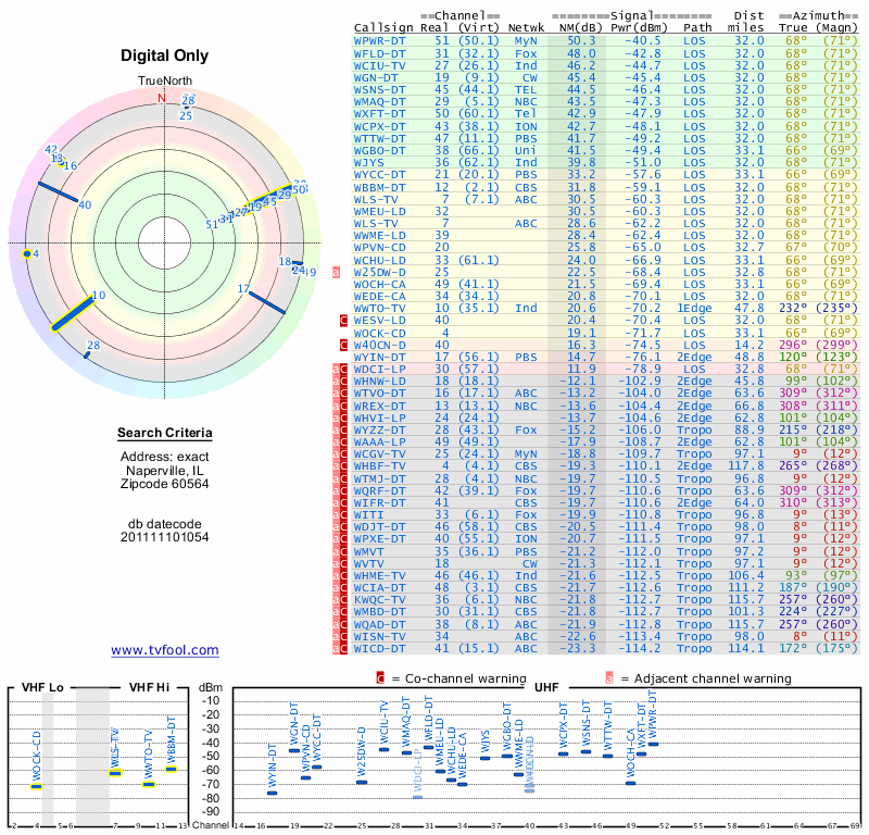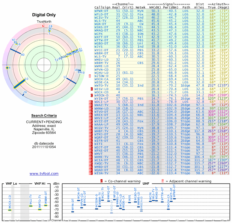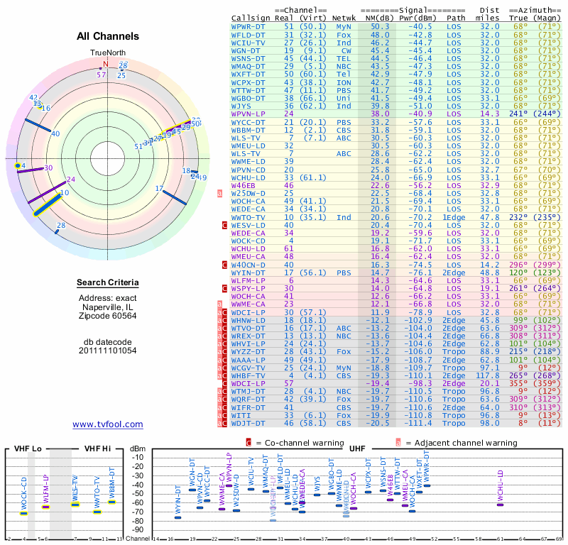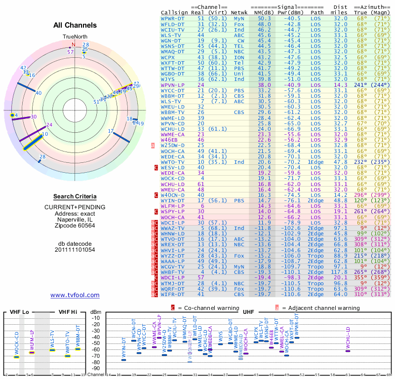 Here are the results for your location. The transmitter database was last updated on June 7, 2013. For more information about these plots and how to interpret them, please check out the Signal Analysis FAQ.