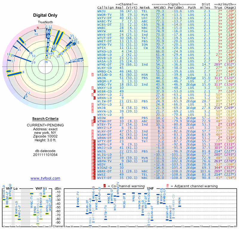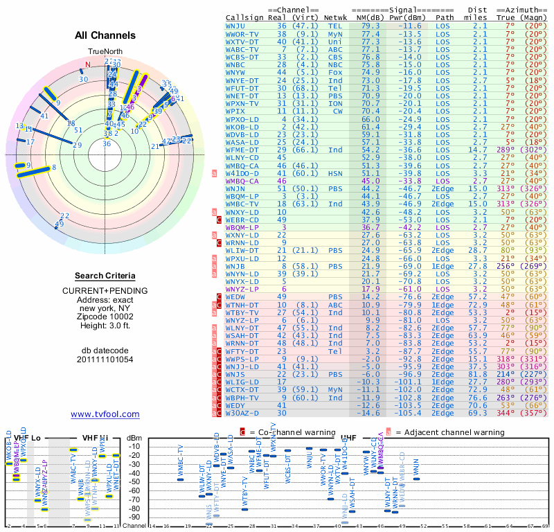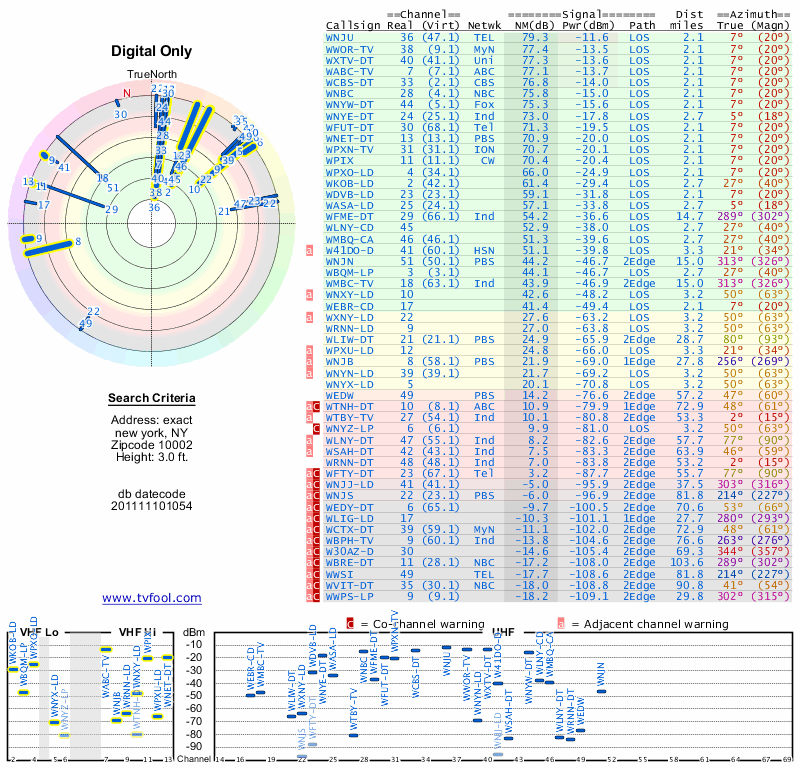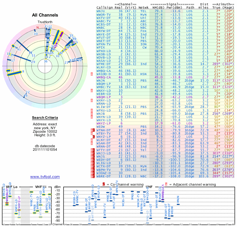 Here are the results for your location. The transmitter database was last updated on June 7, 2013. For more information about these plots and how to interpret them, please check out the Signal Analysis FAQ.