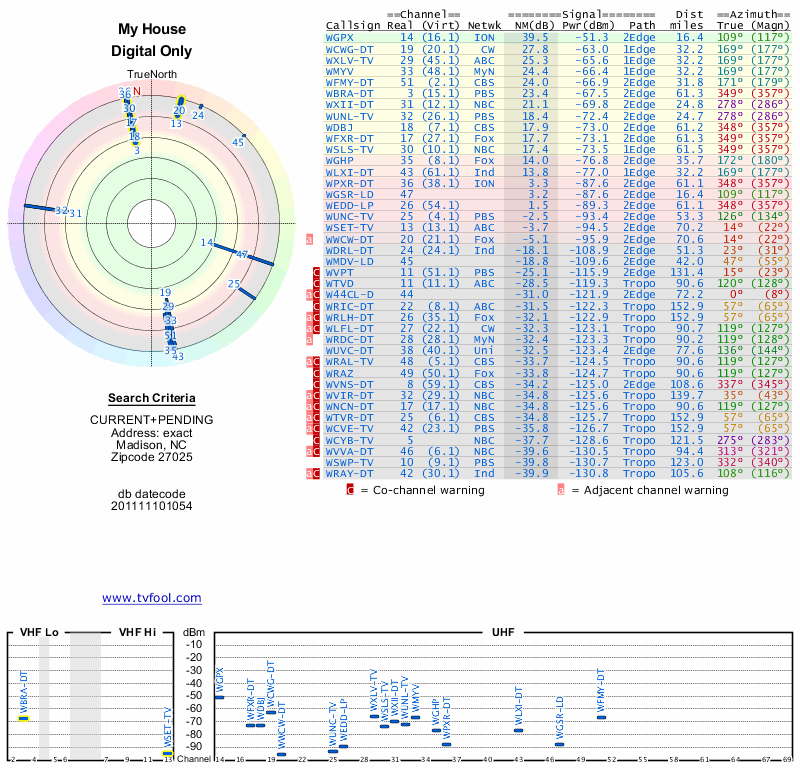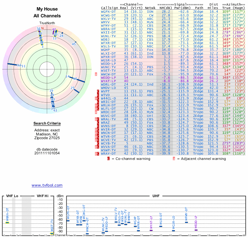 Here are the results for your location. The transmitter database was last updated on June 7, 2013. For more information about these plots and how to interpret them, please check out the Signal Analysis FAQ.