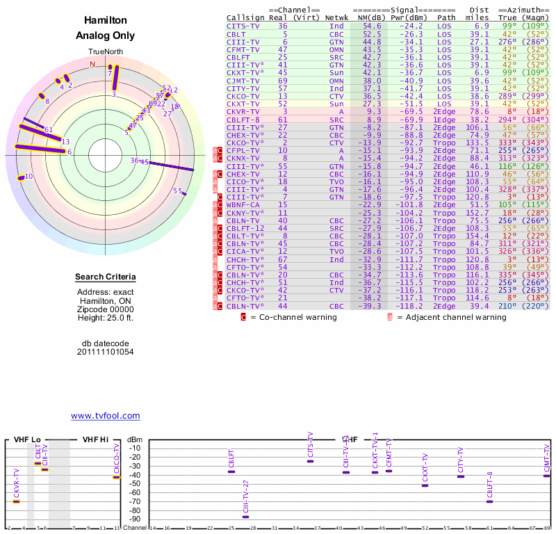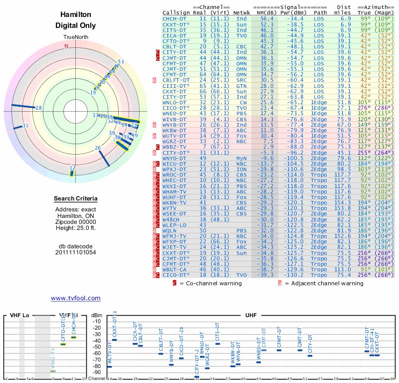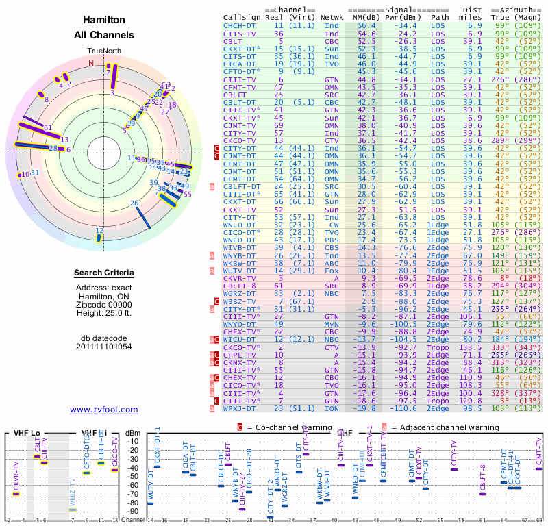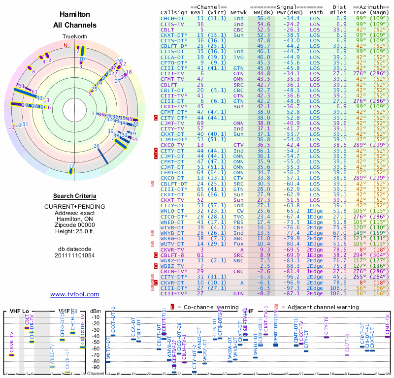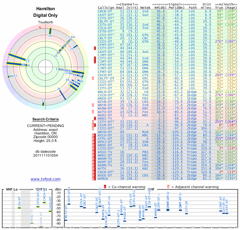 Here are the results for your location. The transmitter database was last updated on June 7, 2013. For more information about these plots and how to interpret them, please check out the Signal Analysis FAQ.