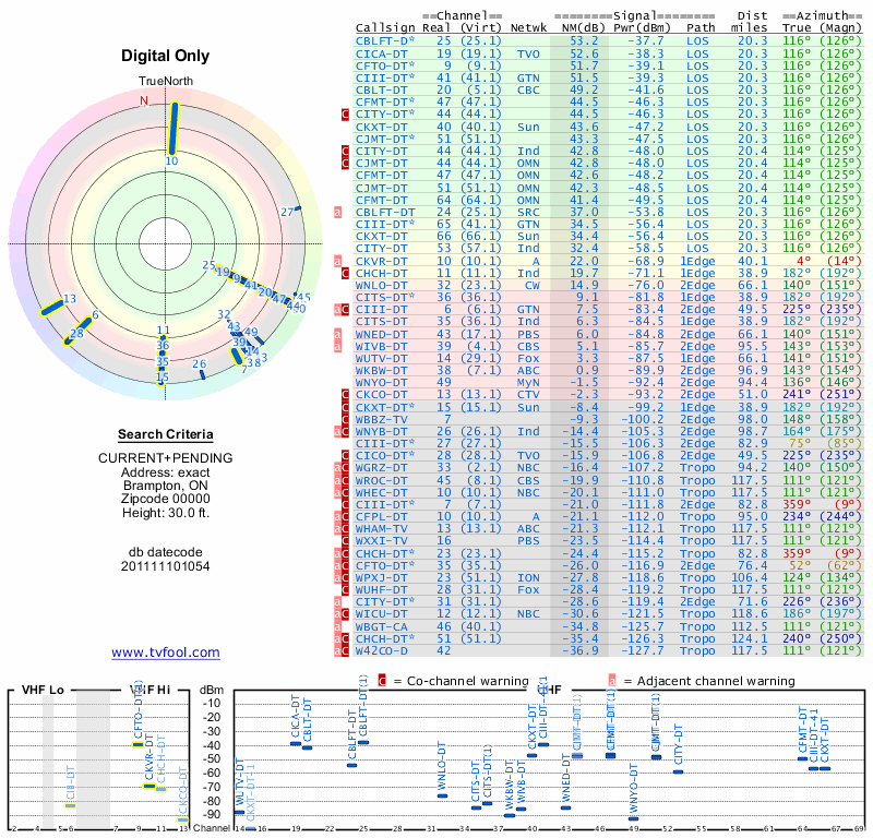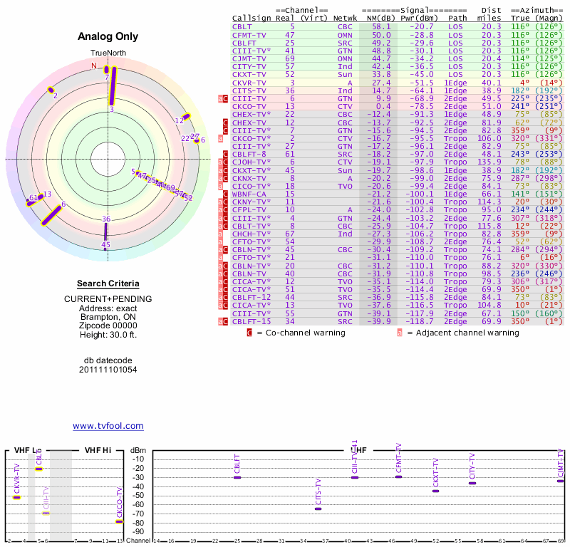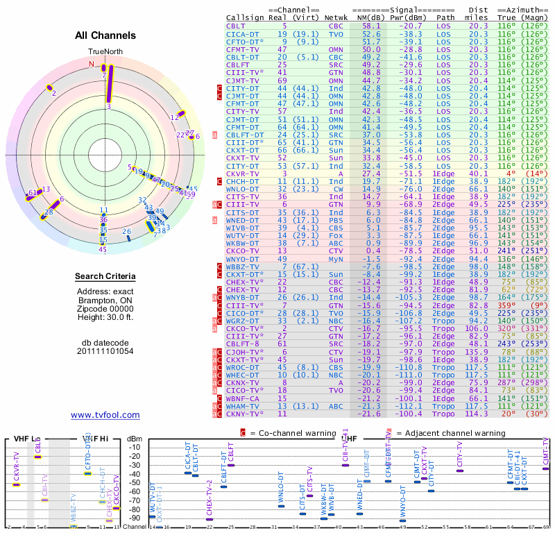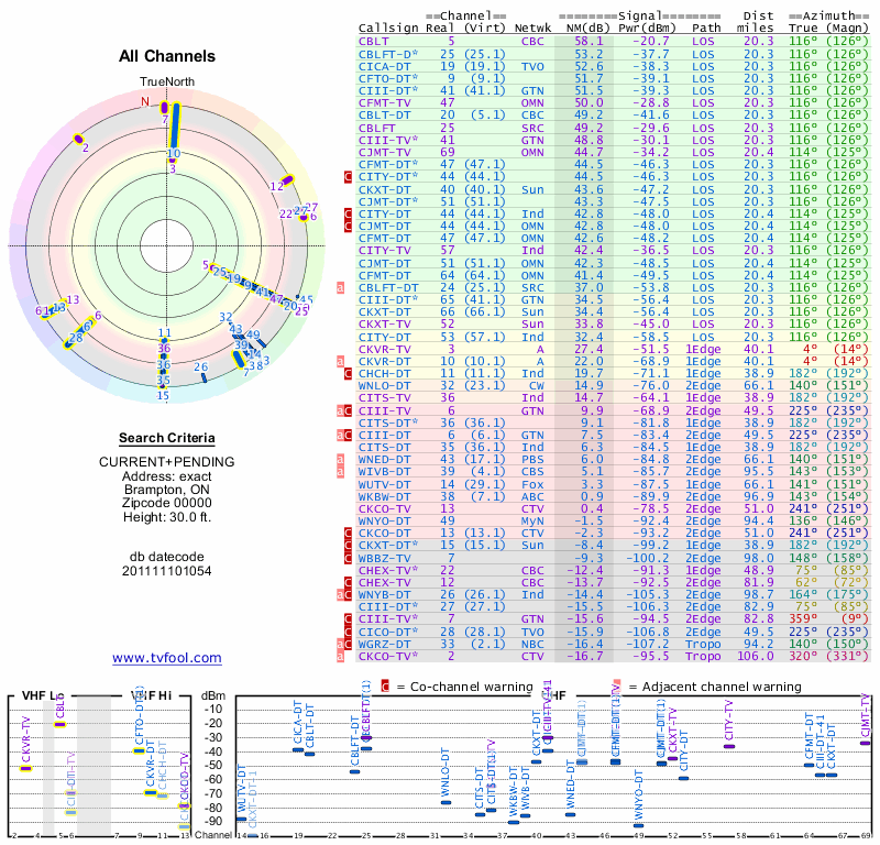 Here are the results for your location. The transmitter database was last updated on June 7, 2013. For more information about these plots and how to interpret them, please check out the Signal Analysis FAQ.