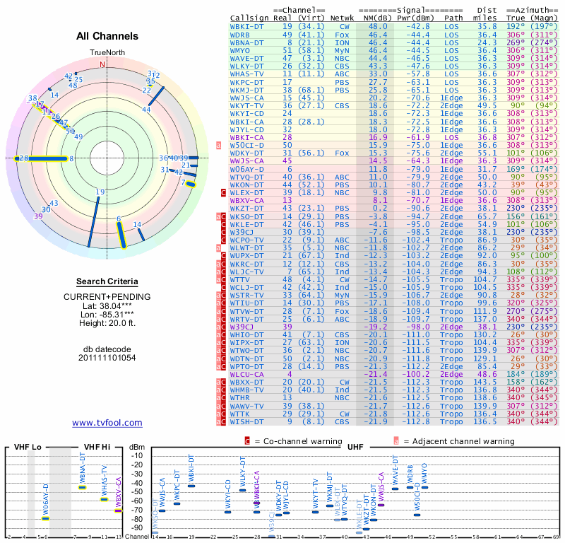 Here are the results for your location. The transmitter database was last updated on June 7, 2013. For more information about these plots and how to interpret them, please check out the Signal Analysis FAQ.