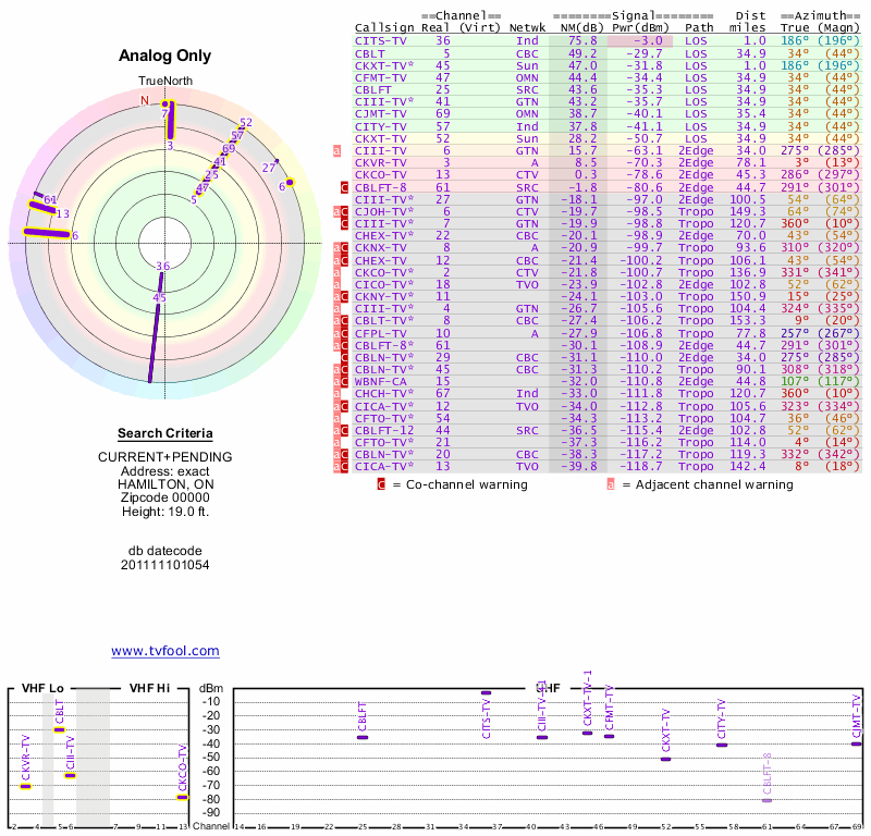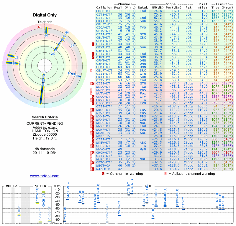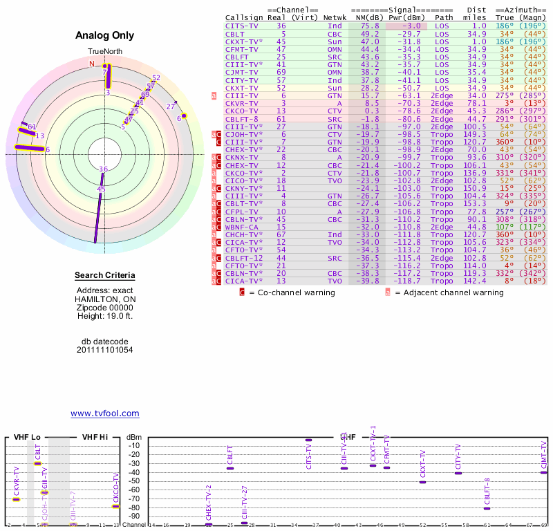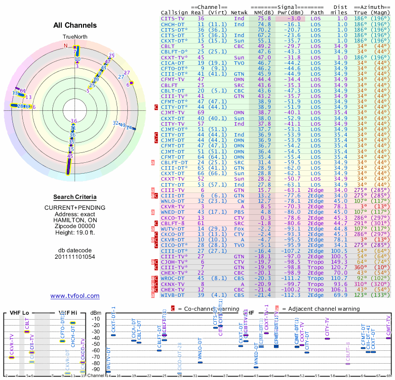 Here are the results for your location. The transmitter database was last updated on June 7, 2013. For more information about these plots and how to interpret them, please check out the Signal Analysis FAQ.