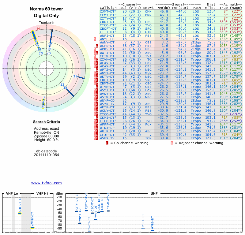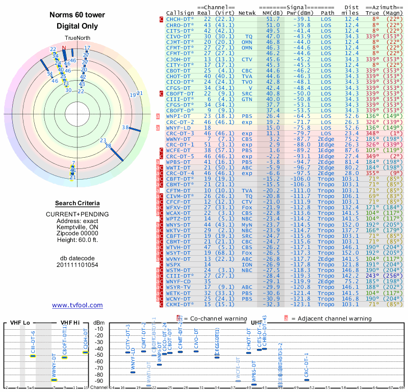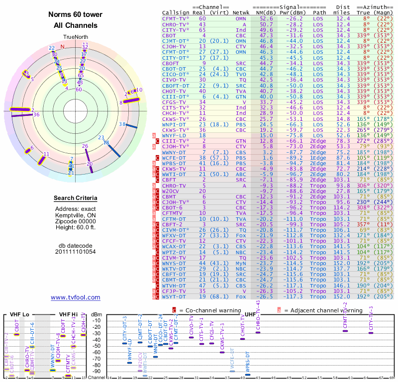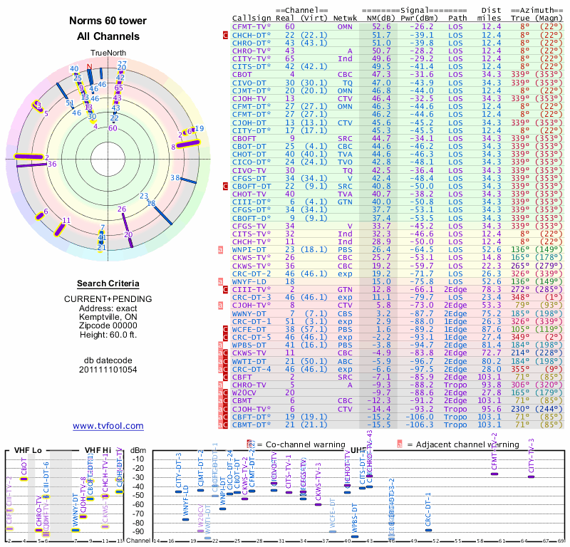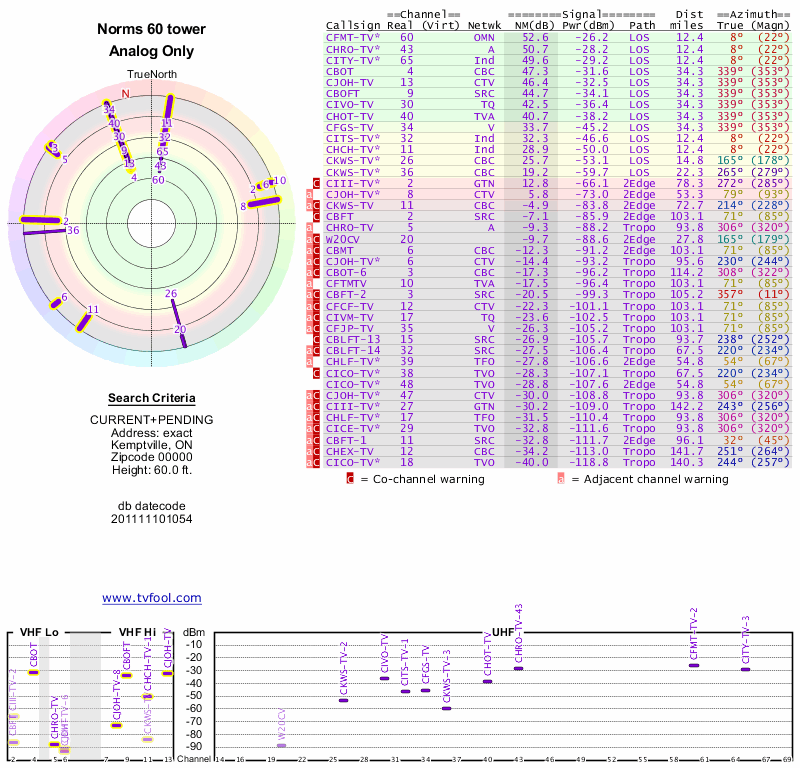 Here are the results for your location. The transmitter database was last updated on June 7, 2013. For more information about these plots and how to interpret them, please check out the Signal Analysis FAQ.