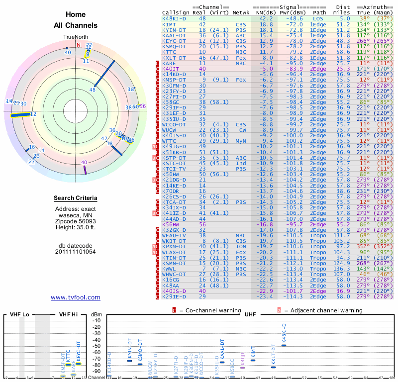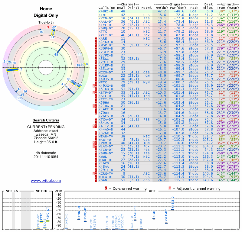 Here are the results for your location. The transmitter database was last updated on June 7, 2013. For more information about these plots and how to interpret them, please check out the Signal Analysis FAQ.