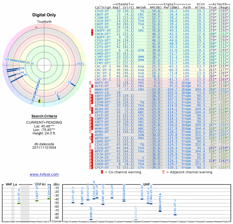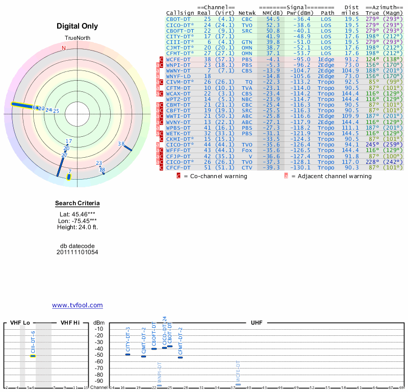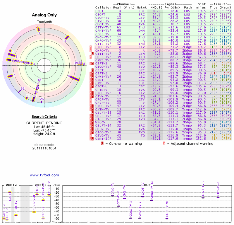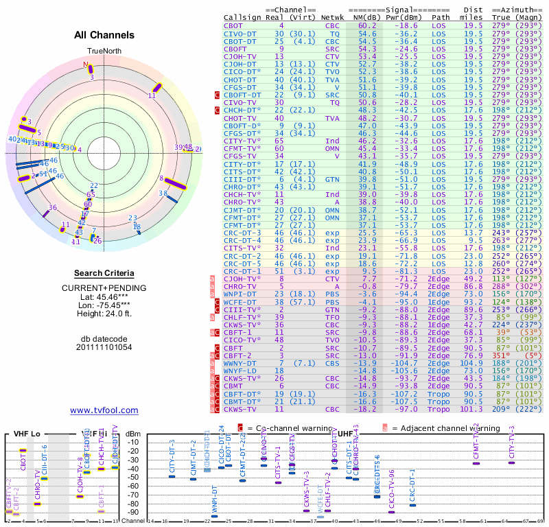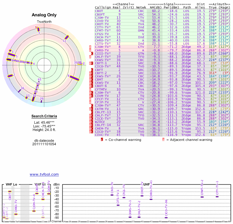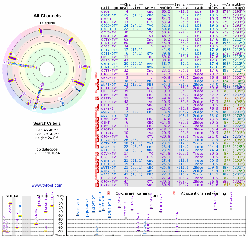 Here are the results for your location. The transmitter database was last updated on June 7, 2013. For more information about these plots and how to interpret them, please check out the Signal Analysis FAQ.